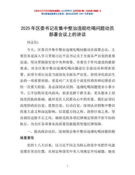 / 2025年区委书记在集中整治违规吃喝问题动员部署会议上的讲话