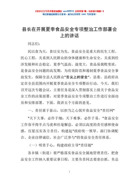 / 县长在开展夏季食品安全专项整治工作部署会上的讲话