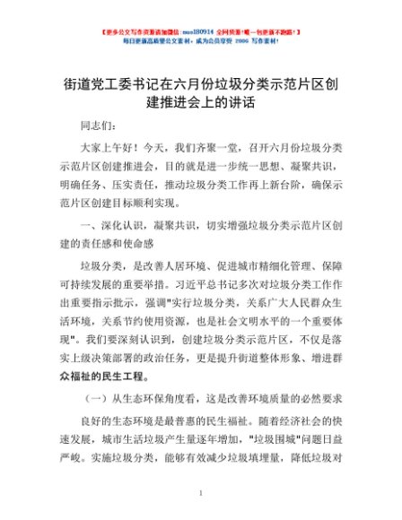 / 街道党工委书记在六月份垃圾分类示范片区创建推进会上的讲话