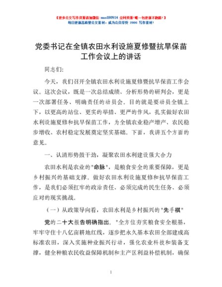 / 党委书记在全镇农田水利设施夏修暨抗旱保苗工作会议上的讲话