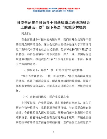 / 县委书记在全县领导干部基层蹲点调研动员会上的讲话:以”四下基层“赋能乡村振兴