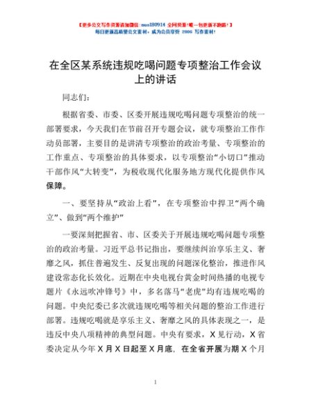 / 在全区某系统违规吃喝问题专项整治工作会议上的讲话