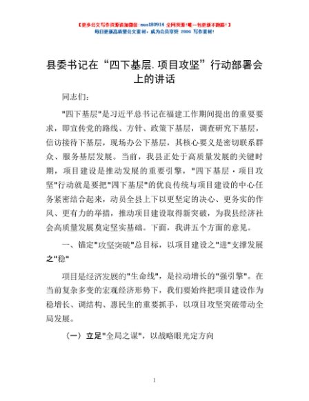 / 县委书记在“四下基层.项目攻坚”行动部署会上的讲话