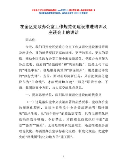 / 在全区党政办公室工作规范化建设推进培训及座谈会上的讲话