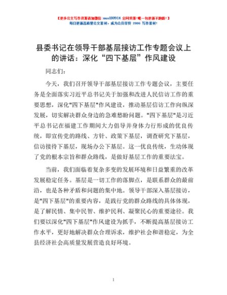 / 县委书记在领导干部基层接访工作专题会议上的讲话:深化“四下基层”作风建设