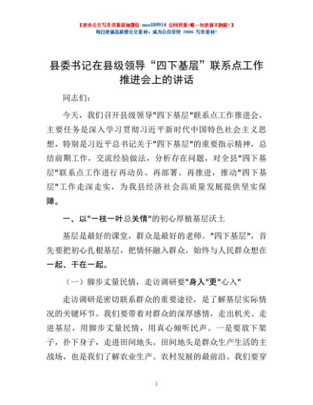 / 县委书记在县级领导“四下基层”联系点工作推进会上的讲话