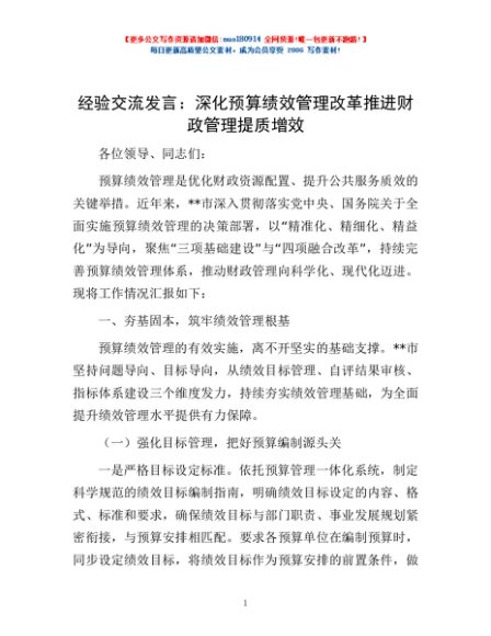 / 经验交流发言:深化预算绩效管理改革 推进财政管理提质增效
