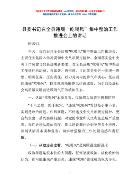 / 县委书记在全县违规“吃喝风”集中整治工作推进会上的讲话