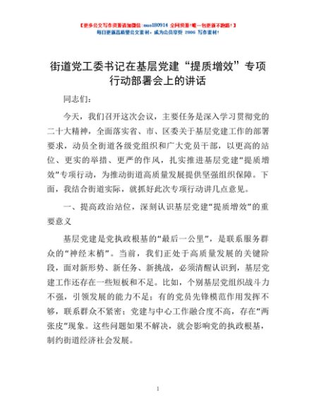 / 街道党工委书记在基层党建 “提质增效” 专项行动部署会上的讲话