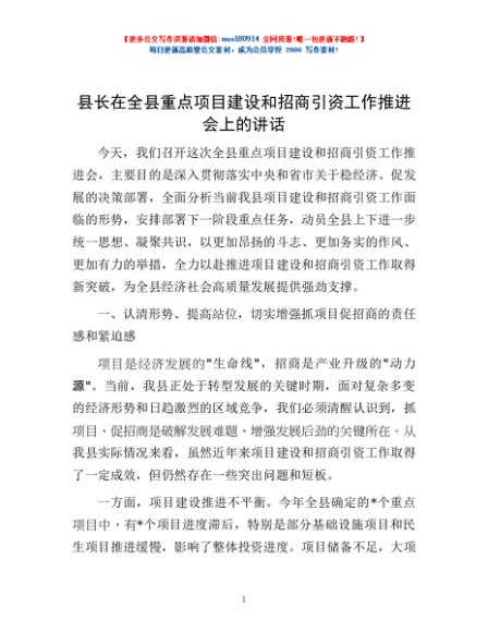 / 县长在全县重点项目建设和招商引资工作推进会上的讲话