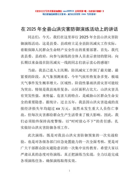 / 在2025年全县山洪灾害防御演练活动上的讲话
