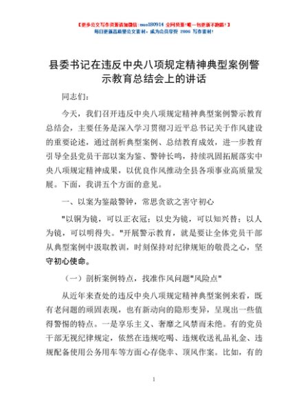 / 县委书记在违反中央八项规定精神典型案例警示教育总结会上的讲话