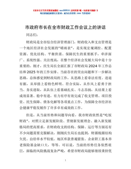 / 市政府市长在全市财政工作会议上的讲话