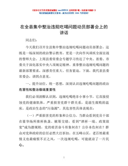 / 在全县集中整治违规吃喝问题动员部署会上的讲话