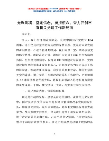 / 党课讲稿:坚定信念,勇担使命,奋力开创市直机关党建工作新局面