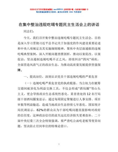 / 在集中整治违规吃喝专题民主生活会上的讲话