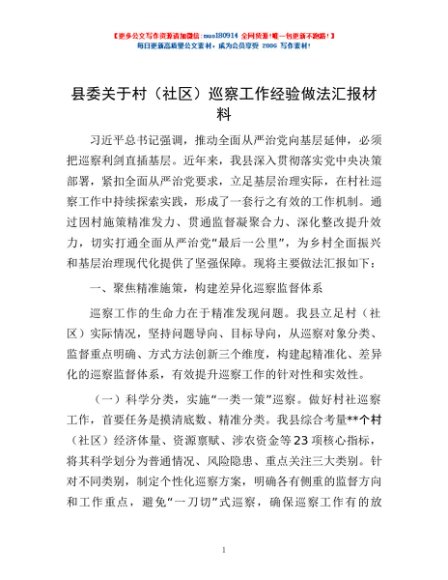/ 县委关于村(社区)巡察工作经验做法汇报材料