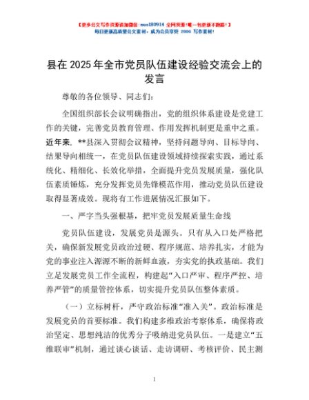 / 县在2025年全市党员队伍建设经验交流会上的发言