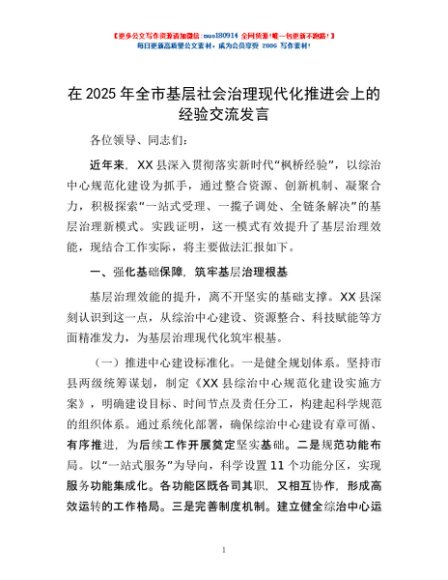 / 在2025年全市基层社会治理现代化推进会上的经验交流发言