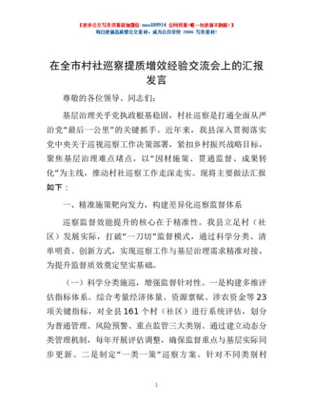 / 在全市村社巡察提质增效经验交流会上的汇报发言
