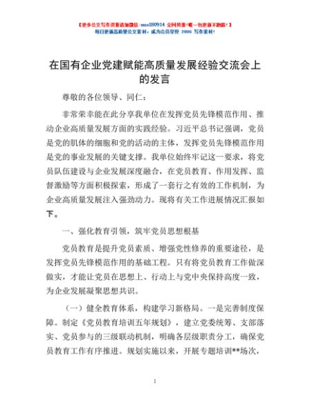 / 在国有企业党建赋能高质量发展经验交流会上的发言