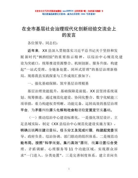 / 在全市基层社会治理现代化创新经验交流会上的发言