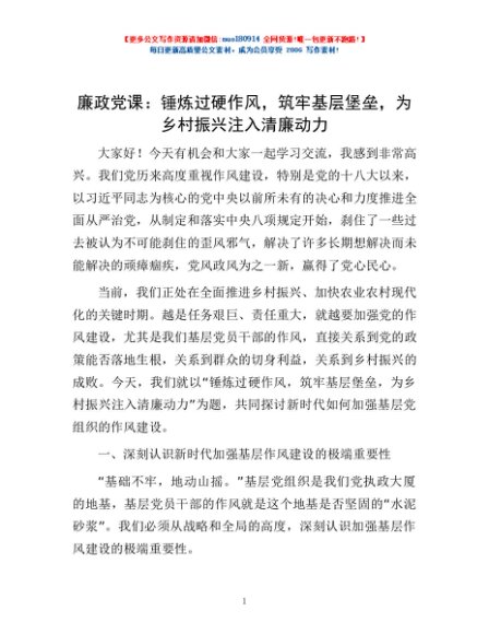 廉政党课:锤炼过硬作风,筑牢基层堡垒,为乡村振兴注入清廉动力