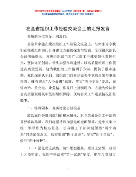 / 在全省组织工作经验交流会上的汇报发言