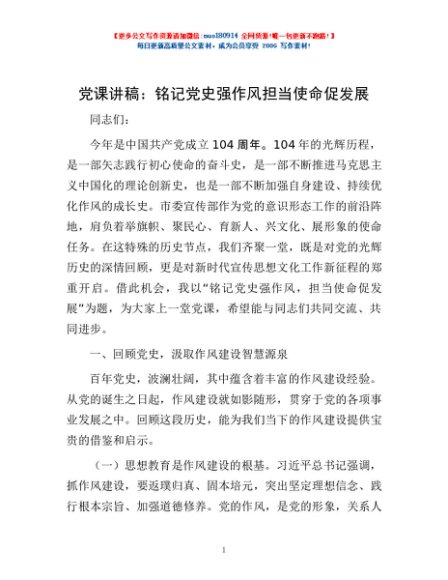 / 党课讲稿:铭记党史强作风 担当使命促发展