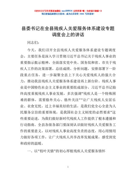 / 县委书记在全县残疾人关爱服务体系建设专题调度会上的讲话