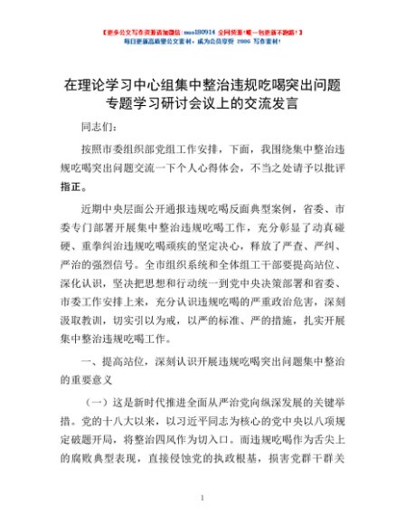 / 在理论学习中心组集中整治违规吃喝突出问题专题学习研讨会议上的交流发言