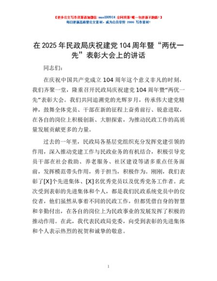 / 在2025年民政局庆祝建党104周年暨“两优一先”表彰大会上的讲话