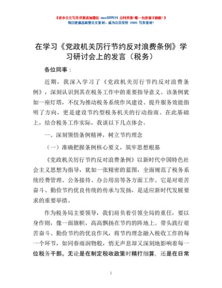 / 在学习《党政机关厉行节约反对浪费条例》学习研讨会上的发言(税务)
