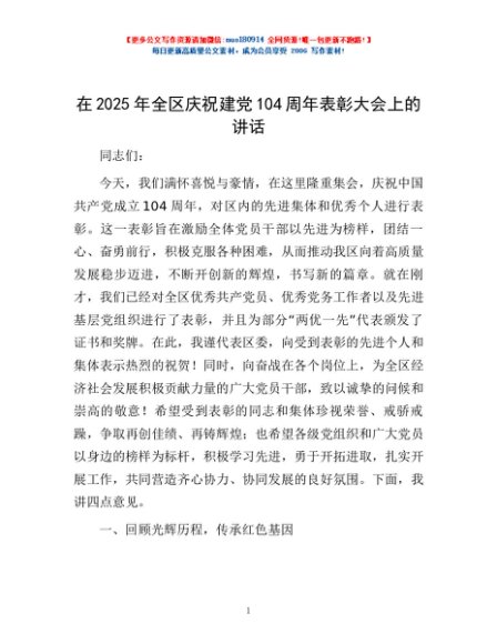 / 在2025年全区庆祝建党104周年表彰大会上的讲话