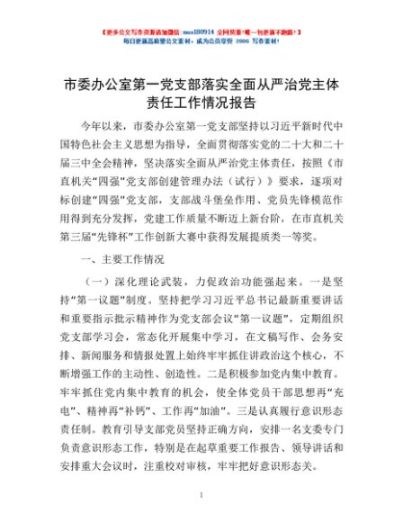/ 市委办公室第一党支部落实全面从严治党主体责任工作情况报告