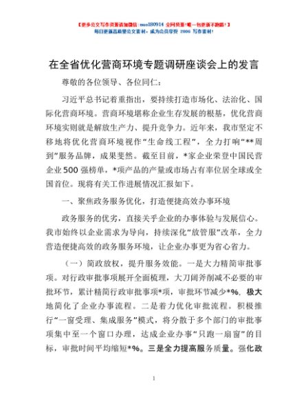/ 在全省优化营商环境专题调研座谈会上的发言