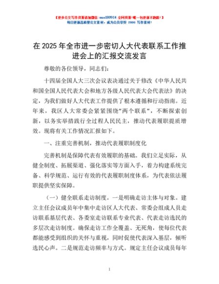 / 在2025年全市进一步密切人大代表联系工作推进会上的汇报交流发言