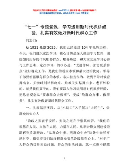 / “七一”专题党课:学习运用新时代枫桥经验,扎实有效做好新时代群众工作