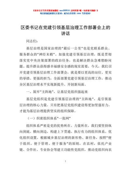 / 区委书记在党建引领基层治理工作部署会上的讲话