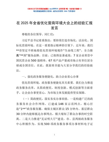 / 在2025年全省优化营商环境大会上的经验汇报发言