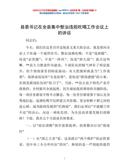 / 县委书记在全县集中整治违规吃喝工作会议上的讲话