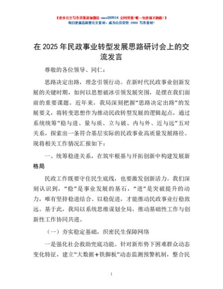 / 在2025年民政事业转型发展思路研讨会上的交流发言