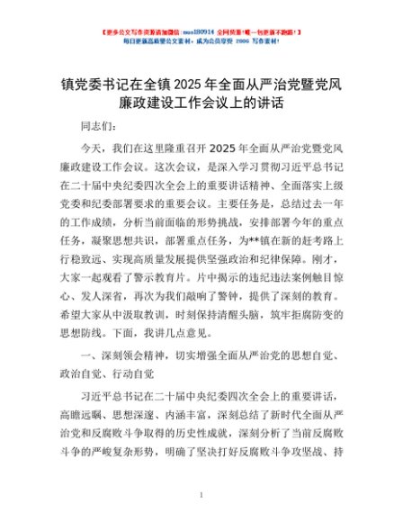 / 镇党委书记在全镇2025年全面从严治党暨党风廉政建设工作会议上的讲话