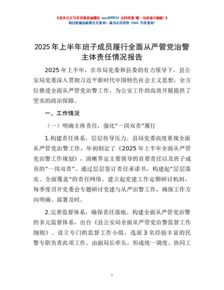/ 2025年上半年班子成员履行全面从严管党治警主体责任情况报告