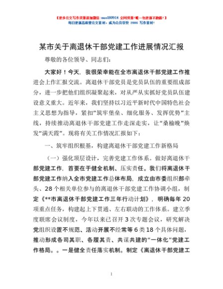 / 某市关于离退休干部党建工作进展情况汇报