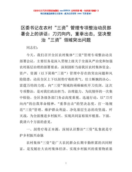 / 区委书记在农村“三资”管理专项整治动员部署会上的讲话:刀刃向内,重拳出击,坚决整治“三资”领域突出问题