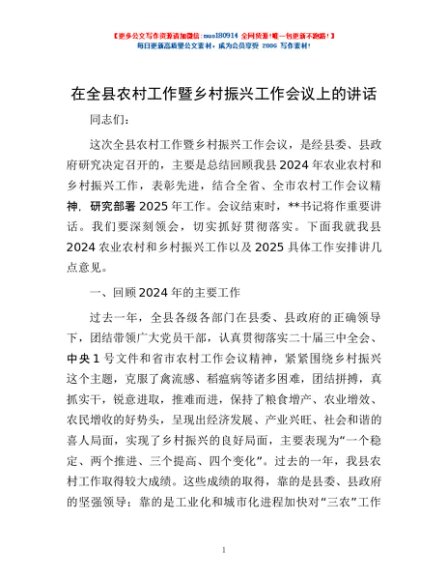 / 在全县农村工作暨乡村振兴工作会议上的讲话