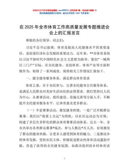 / 在2025年全市体育工作高质量发展专题推进会会上的汇报发言