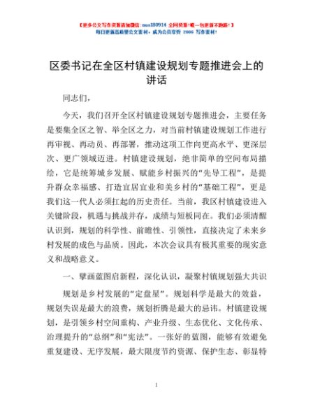/ 区委书记在全区村镇建设规划专题推进会上的讲话