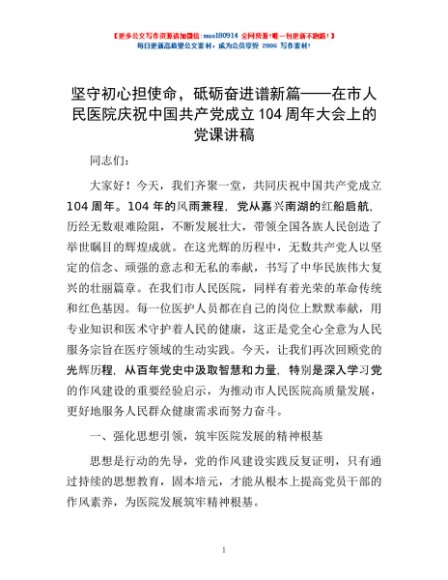 / 坚守初心担使命,砥砺奋进谱新篇——在市人民医院庆祝中国共产党成立104周年大会上的党课讲稿